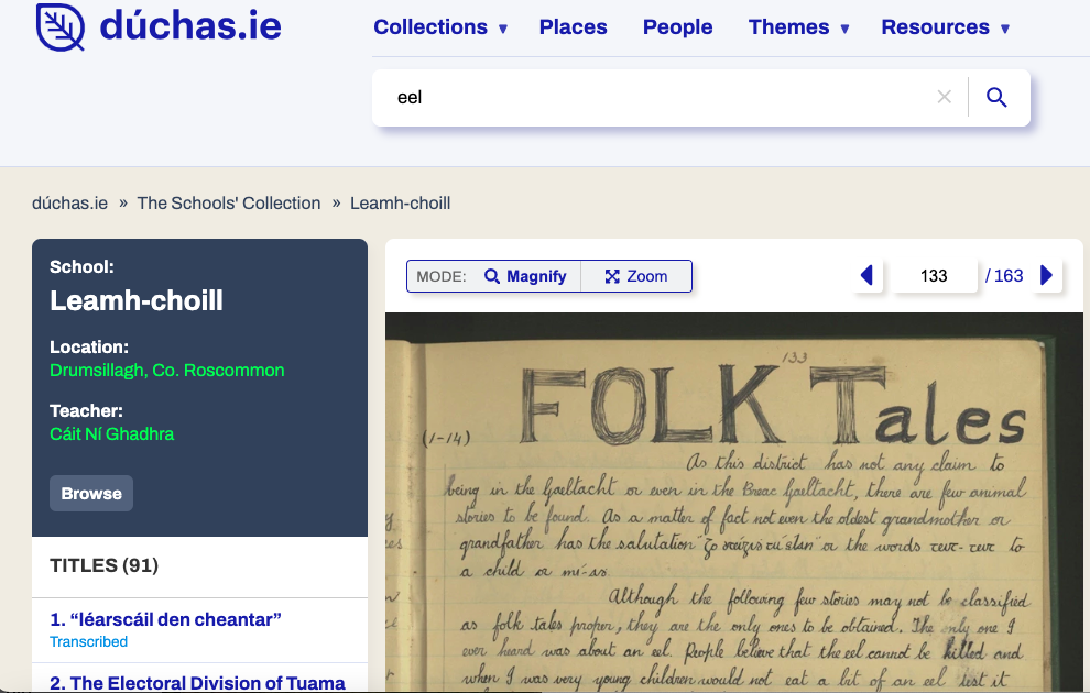 The resulting collection is known as the Schools’ Manuscript Collection 1937 – 1938 and is available in most county libraries around Ireland. Amazingly, you can also find it online. Following a colossal effort the collection has been digitized — freely available for anyone to delve into, along with millions of other documents from the National Folklore Collection, hosted at University College Dublin.Â